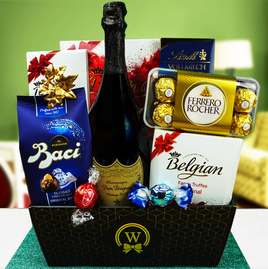 Luxurious and stunning gift basket especially for those who understand what quality is. Decorative basket with top chocolates And Dom Perignon Champagne.